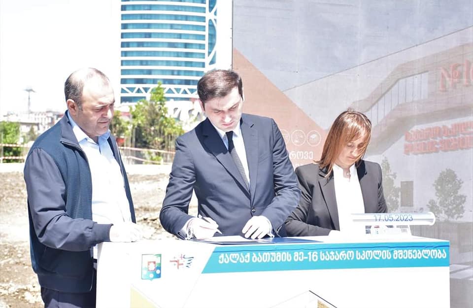 ბათუმის საკრებულოს თავმჯდომარე რამაზ ჯინჭარაძე და საკრებულოს წევრები, დღეს, 16-ე საჯარო სკოლის ტერიტორიაზე, თანამედროვე სტანდარტების, 1000 მოსწავლეზე გათვლილი, ახალი საჯარო სკოლის მშენებლობის დაწყების ცერემონიას დაესწრნენ.